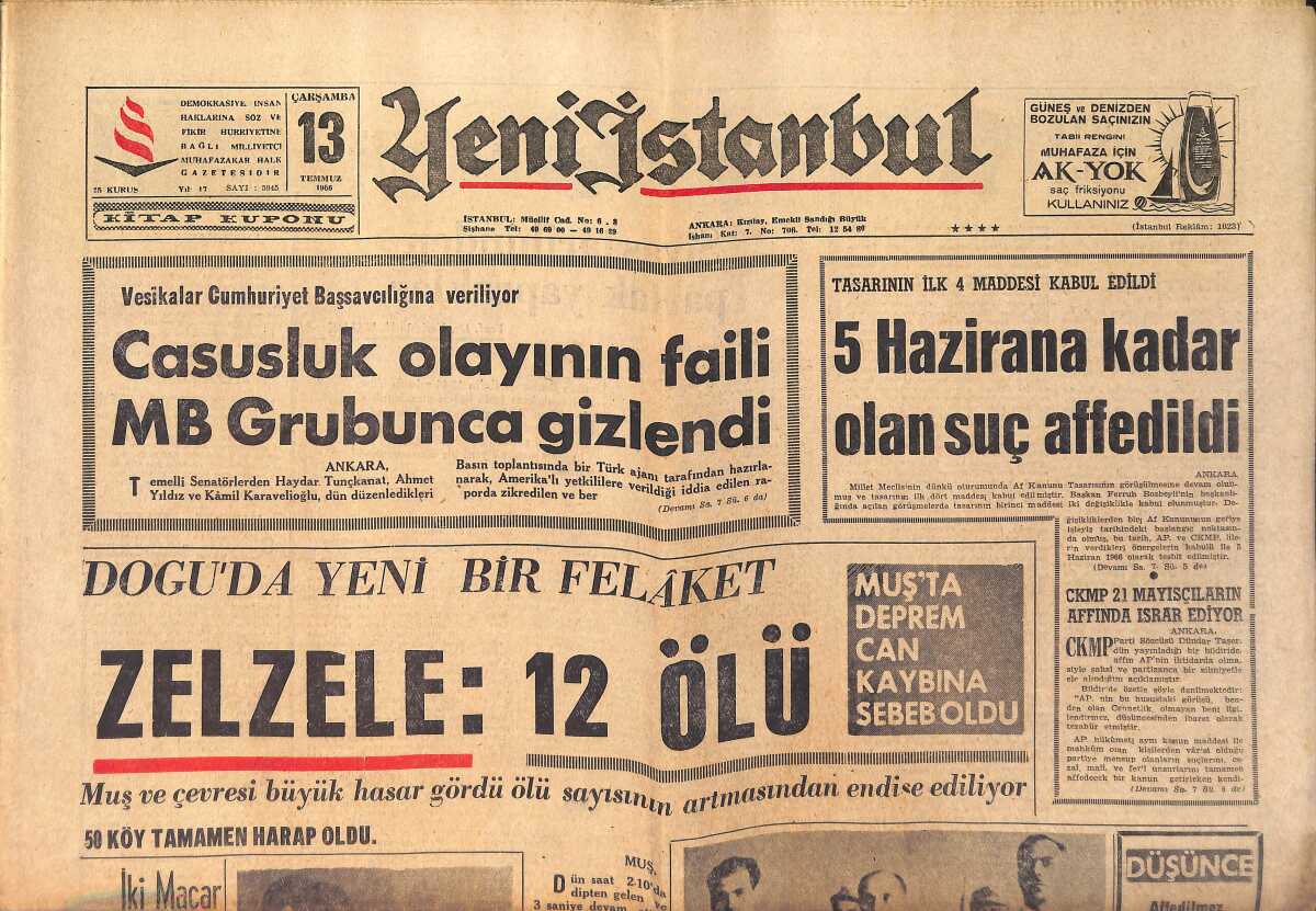 Yeni İstanbul Gazetesi 13 Temmuz 1966 - Muş'ta Deprem Can Kaybına Sebep Oldu GZ158743