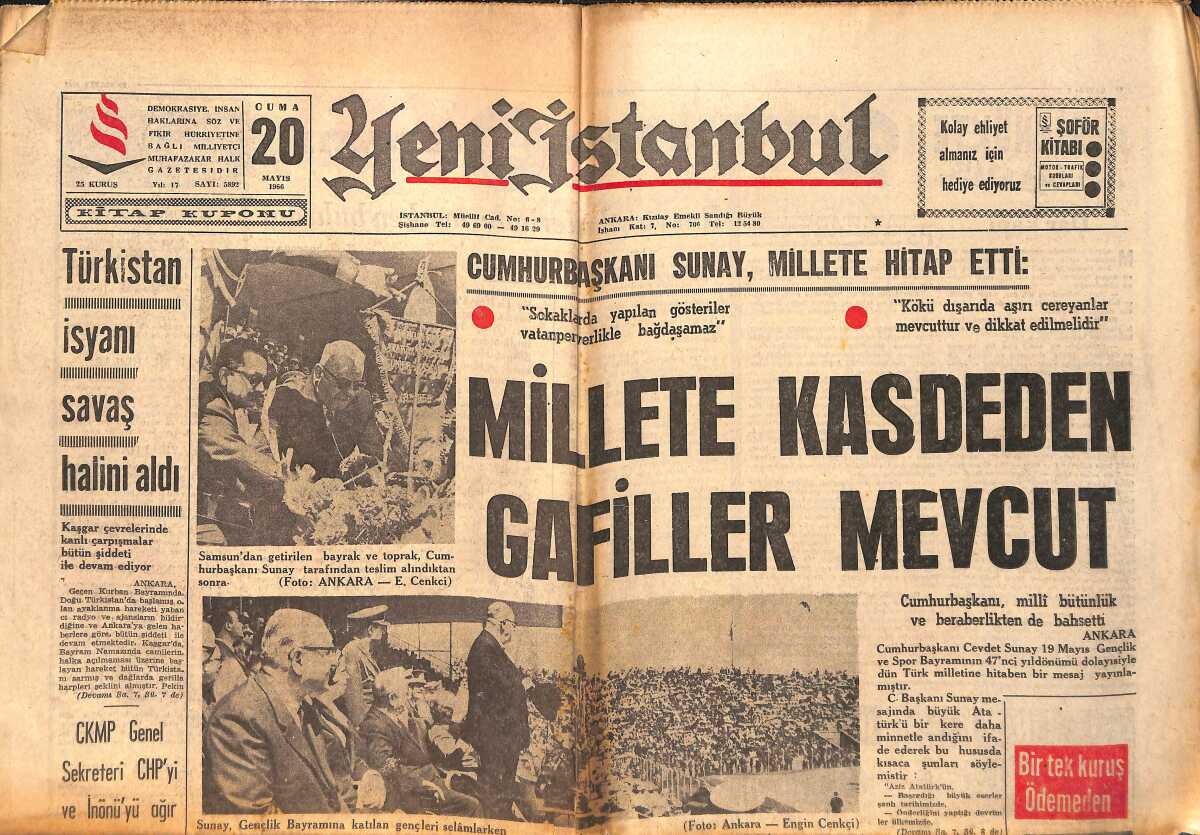 Yeni İstanbul Gazetesi 20 Mayıs 1966 - Türkistan İsyanı Savaş Halini Aldı - Cumhurbaşkanı Sunay , Millete Hitap Etti GZ158669
