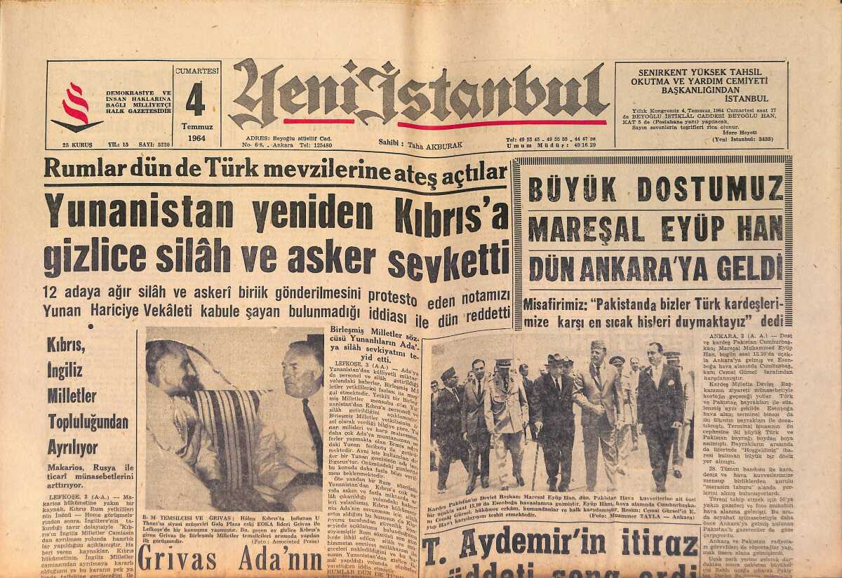Yeni İstanbul Gazetesi 4 Temmuz 1964 - Yunanistan Yeniden Kıbrıs'a Gizlice Silah Ve Asker Sevketti GZ158767