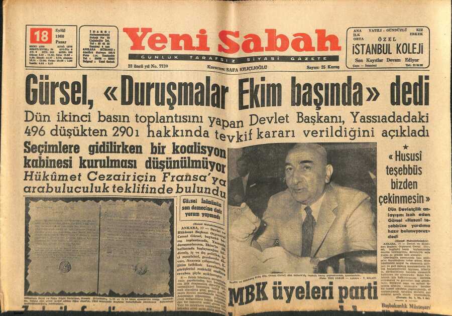 Yeni Sabah 18 Eylül 1960 - Gürsel Duruşmalar Ekim Başında dedi. - Suzan Sözen İfade Verdi.